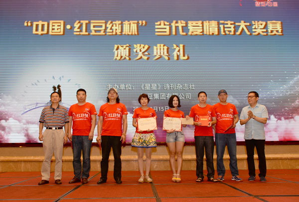 為了進一步繁榮愛情詩創作,弘揚正確愛情觀,特別是推動中國當代愛情詩再度輝煌,2014年7月1日,由《星星》詩刊雜志社與紅豆集團聯合啟動了“中國?紅豆絨杯”當代愛情詩大獎賽征文活動,作為紅豆七夕節的一項重要活動。現在經過一年的征集及后期評選,在今年七夕——中國情人節前夕頒獎。