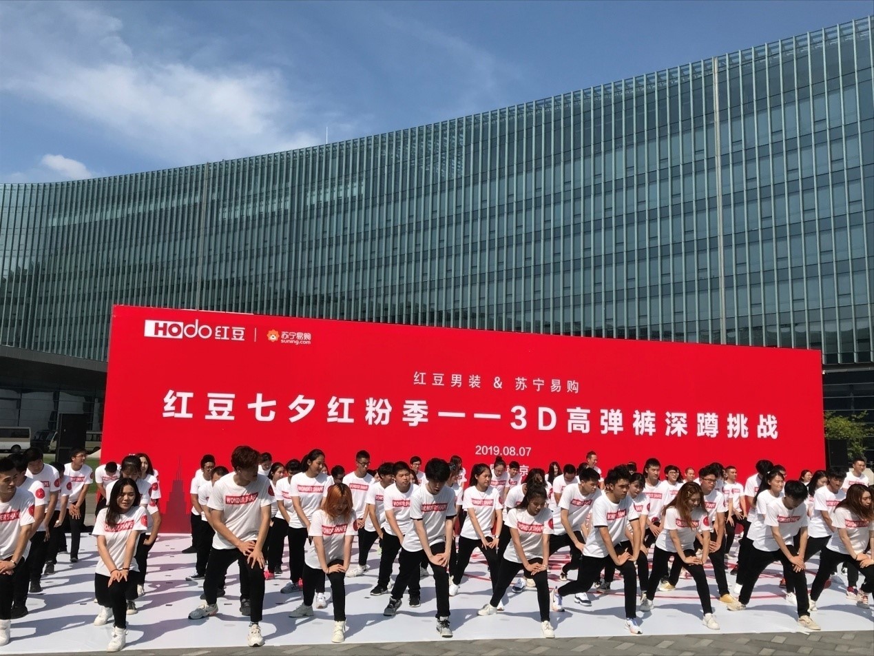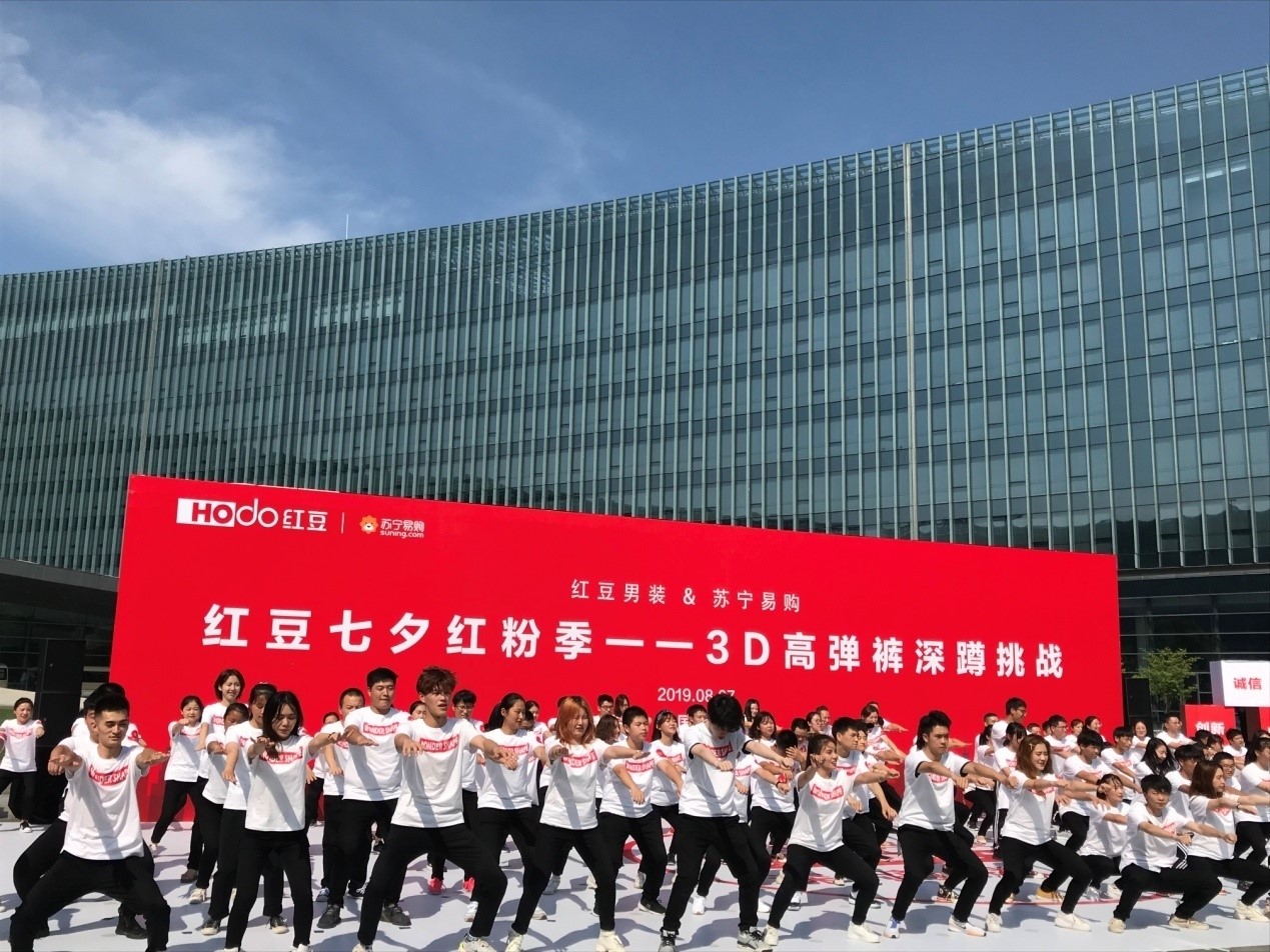 內(nèi)場的發(fā)布會全面啟動線上銷售,而外場深蹲挑戰(zhàn)是一場對高彈褲的探索,將會顛覆你對褲子的認知,通過切身體驗產(chǎn)品的形式更直觀地展現(xiàn)了第三代紅豆3D高彈褲的高彈力、回復性與舒適度。深蹲挑戰(zhàn)還融合了七夕的主題,77對情侶在七夕這一天身穿紅豆3D高彈褲,默契搭檔挑戰(zhàn)深蹲,在音樂的變換中完成指定動作,深蹲、弓步、抬腿……他們挑戰(zhàn)自我、配合默契,突破傳統(tǒng)褲子對身體的束縛,在展現(xiàn)3D高彈褲產(chǎn)品優(yōu)點的同時,增強彼此間的互動,也為這場挑戰(zhàn)增添了甜蜜與浪漫。這場有趣的挑戰(zhàn)更像是一次情侶間默契度的考驗,也將會成為他們難忘的七夕體驗。紅豆的匠心產(chǎn)品與蘇寧平臺相結(jié)合,在七夕這個特殊的日子里,集結(jié)紅粉與77對情侶,用別具一格的深蹲挑戰(zhàn)形式演繹經(jīng)典產(chǎn)品的全新面貌。