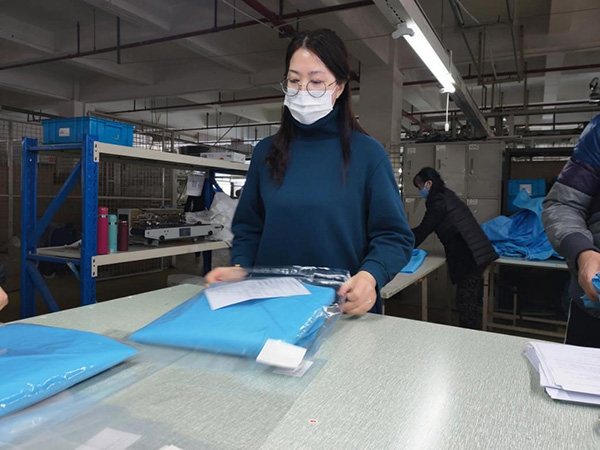 當天晚上,紅豆國際黨委書記戴敏君立即號召黨員干部赴生產“前線”支援,于是3月1日早上7點,在一線生產車間,出現了紅豆500多名黨員干部包裝“戰衣”,帶領始終在一線堅守的廣大員工一起加油干的火熱場面。