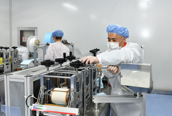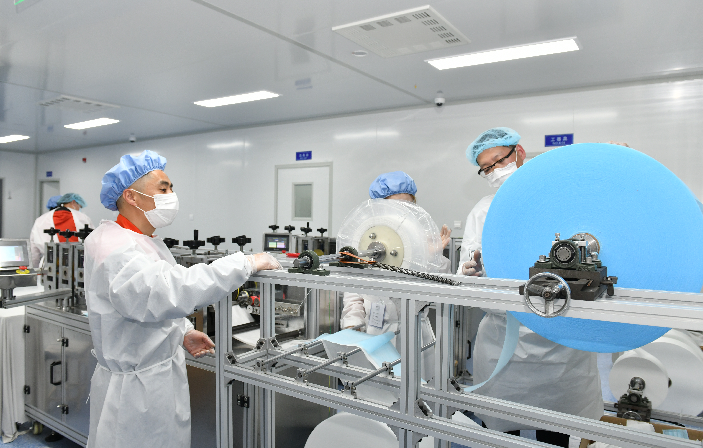 他說,剛開始心里也沒底,畢竟沒有搞過,在和小伙伴們一起研究、反復(fù)摸索后總算有了門道。吳曉東介紹,在半自動(dòng)生產(chǎn)過程中,口罩面罩的生產(chǎn)由機(jī)器完成,再由人工熔接耳帶;全自動(dòng)生產(chǎn)過程中,無紡布、熔噴布、鼻梁架、耳帶線等原材料只需放在對(duì)應(yīng)位置上即可,不再需要其他工序。在這些過程中,機(jī)器的精確程度都影響著次品率。長途運(yùn)輸、稍有不慎,一個(gè)螺絲的松動(dòng)、一個(gè)刀口的裂紋都會(huì)影響口罩面罩的切縫、鼻梁架的位置偏移,而調(diào)試工作就是讓這些機(jī)器盡可能嚴(yán)絲合縫,從而發(fā)揮最大效能。同樣面對(duì)陌生的設(shè)備,吳曉東憑借自身學(xué)習(xí)經(jīng)驗(yàn)和對(duì)機(jī)械的興趣與鉆研,不斷與新設(shè)備磨合,在一次次糾正和摸索中,屢屢找出最佳解決方案。口罩全自動(dòng)生產(chǎn)過程中,一條生產(chǎn)線出現(xiàn)了切不斷面罩的問題,吳曉東第一時(shí)間趕到現(xiàn)場(chǎng),認(rèn)真校準(zhǔn)、仔細(xì)判斷,直到發(fā)現(xiàn)問題出在一片刀片上,只需替換即可。診斷設(shè)備的吳曉東看著沉著冷靜,其實(shí)心里也沒底,全憑經(jīng)驗(yàn)摸黑前行,他坦言,最擔(dān)心生產(chǎn)前后道跟不上,不能保證產(chǎn)能,只能一點(diǎn)一點(diǎn)試、一點(diǎn)一點(diǎn)調(diào),和時(shí)間賽跑,直到合格的面罩一片片從出口快速飛出、全部設(shè)備滿負(fù)荷生產(chǎn)。從剛開始的親自安裝調(diào)試,到后來指導(dǎo)技術(shù)人員安裝調(diào)試口罩生產(chǎn)線,吳曉東獲得了車間管理人員和工人的一致贊譽(yù),成為技術(shù)大師傅。
