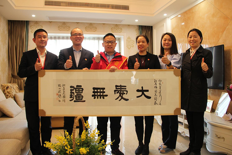 下午,紅豆集團(tuán)常務(wù)副總裁、國(guó)際公司董事長(zhǎng)戴敏君,集團(tuán)品牌文化部部長(zhǎng)錢文華率紅豆物業(yè)團(tuán)隊(duì)來到殷晉偉家,上門送上最誠(chéng)摯的慰問,贈(zèng)予殷晉偉“大愛無疆”牌匾,代表紅豆集團(tuán)全體員工向英雄表達(dá)崇高敬意!“大愛無疆”牌匾由中國(guó)書法家協(xié)會(huì)理事、無錫市國(guó)畫院院長(zhǎng)孫璘先生親自揮毫?xí)鴮懀P鋒蒼勁有力,一筆一畫盡顯孫璘先生對(duì)“逆行英雄”的真情真意。