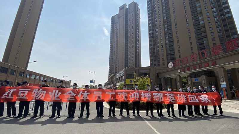 出征還是冬日,歸來已是花期。經(jīng)過70多天的奮戰(zhàn),武漢重啟,英雄凱旋。4月14日上午,紅豆香江豪庭小區(qū)援鄂英雄殷晉偉醫(yī)生凱旋回家,懷著對(duì)英雄的崇高敬意,紅豆物業(yè)全體員工早已列隊(duì),手拿紅旗,拉起了歡迎條幅——“紅豆物業(yè)全體員工歡迎援鄂英雄回家”,在小區(qū)門口等候英雄的到來。
