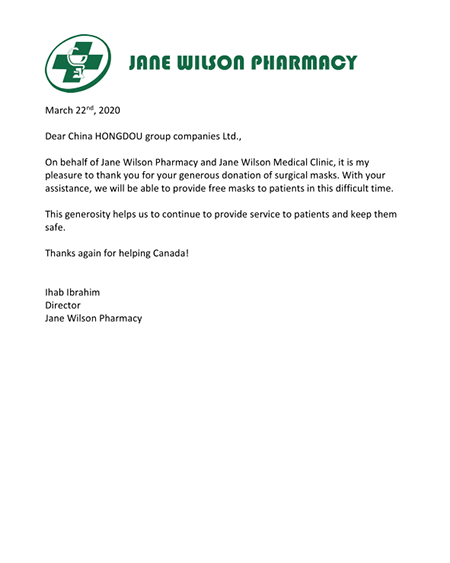 同時,紅豆又向加拿大藥店、警察局、診所共捐贈1000個口罩,加拿大方給我們發來感謝信。
