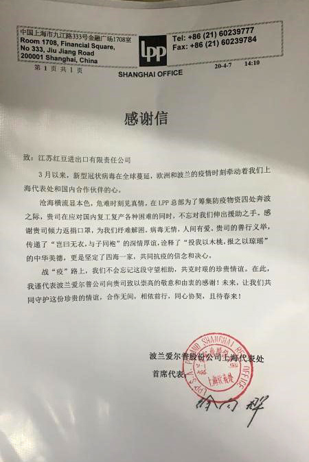 3 月中旬,紅豆向波蘭的這個客戶返捐600個口罩,對方收到口罩后,表示感激,并寫來感謝信,感謝紅豆的雪中送炭。